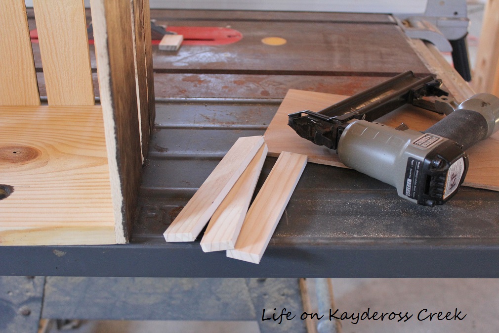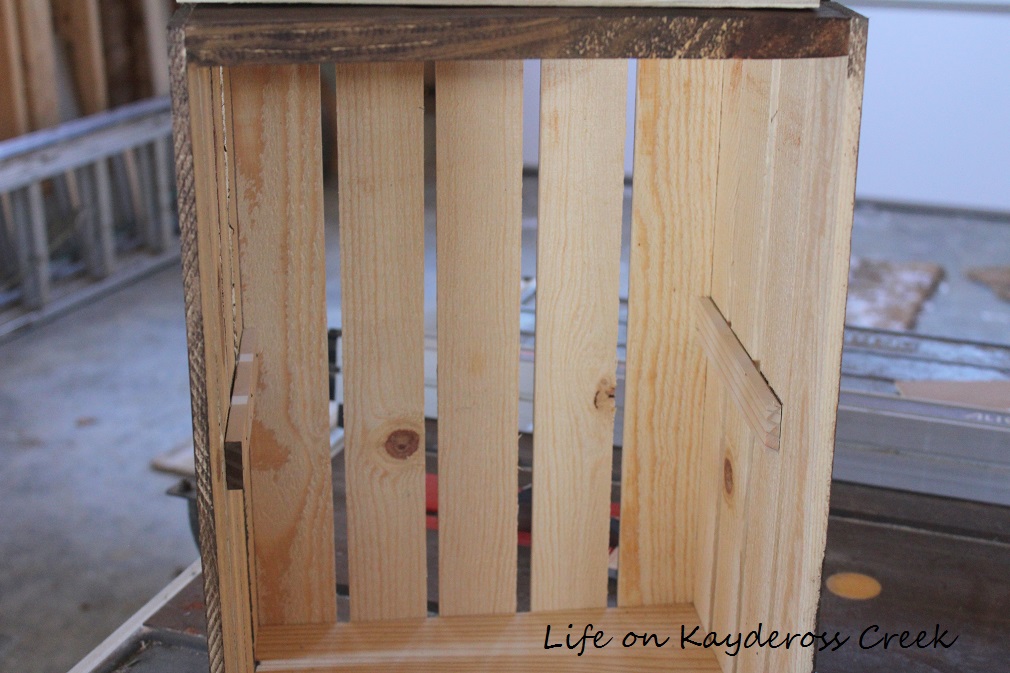 Once those were removed I slid the shelf right in. I glued it in place with wood glue and covered up the raw edge with a left over piece of pine my husband had on hand and cut to size, which was the same material as the brackets for the crates.