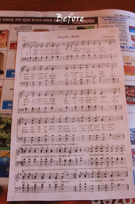 Fortunately, the paper had the entire song right in the middle of the page. Imagine that. I cut out the entire song from the middle and it was the perfect size to fit centered inside the frame. The white paper looked a bit too new and I wanted the edges to be a bit rough so I didn’t worry about whether or not the sides were straight. To get an even more rough look I sanded, yes sanded, the edges with sandpaper. The sandpaper rips up the sides just a bit but you have to be careful because if you press too hard you can rip it.