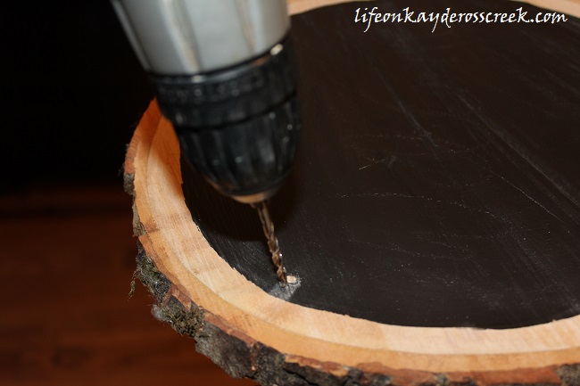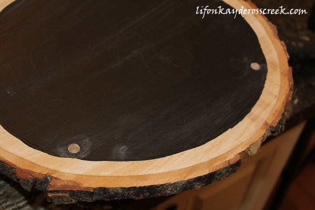 This is how it started out. It was a bit rough so I used the palm sander on it to smooth it out. When it was really smooth, clean and dry, I painted on the chalkboard paint in a circle almost to the edge of the bark. I used a 1″ angled brush which really helped form the circle. Then I drilled holes evenly on the top to string the twine so I cold hang it.