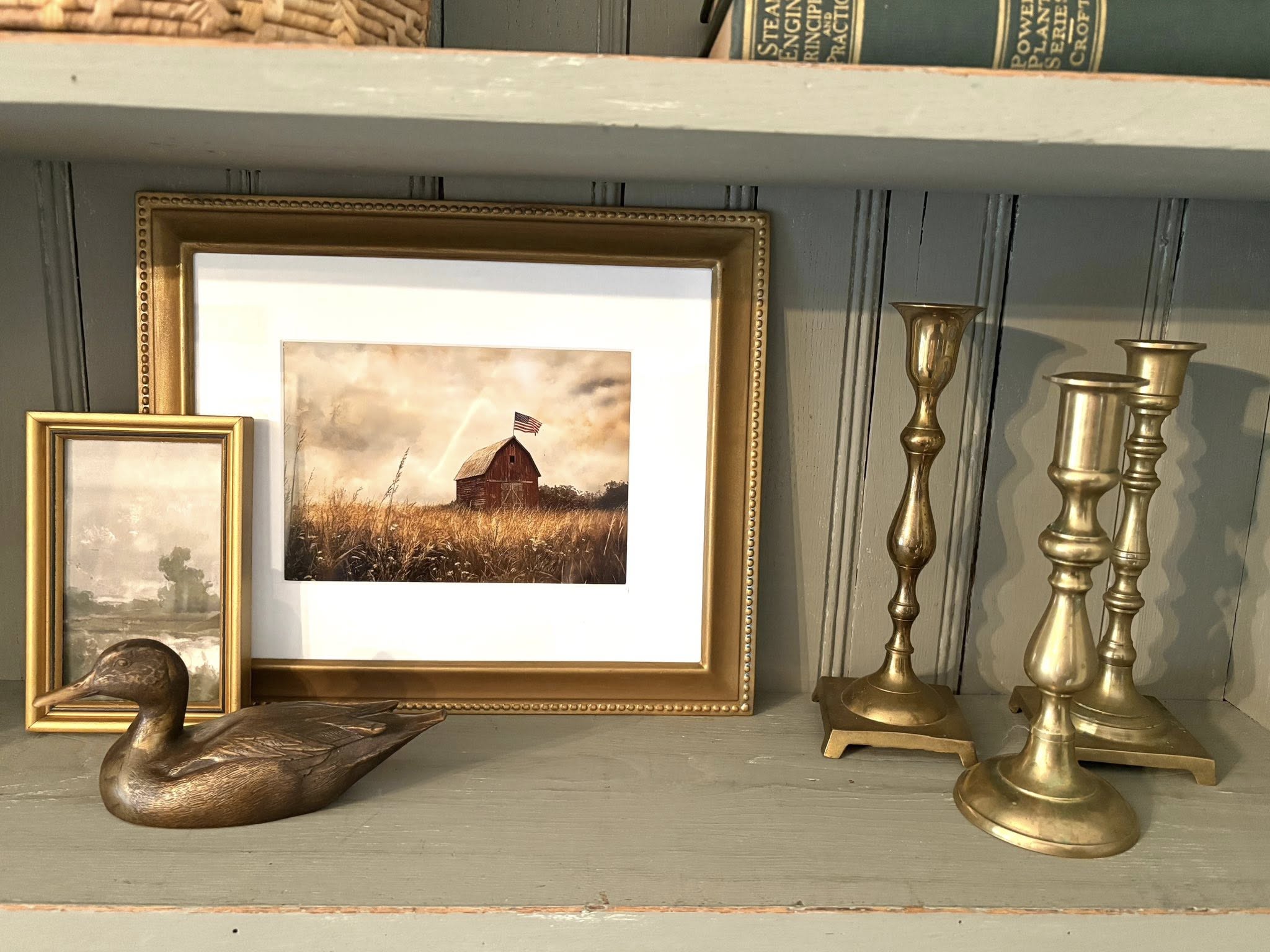 For example, a rustic bronze duck on a stack of books becomes a focal point, especially when layered in front of artwork and paired with candlesticks of varying heights.